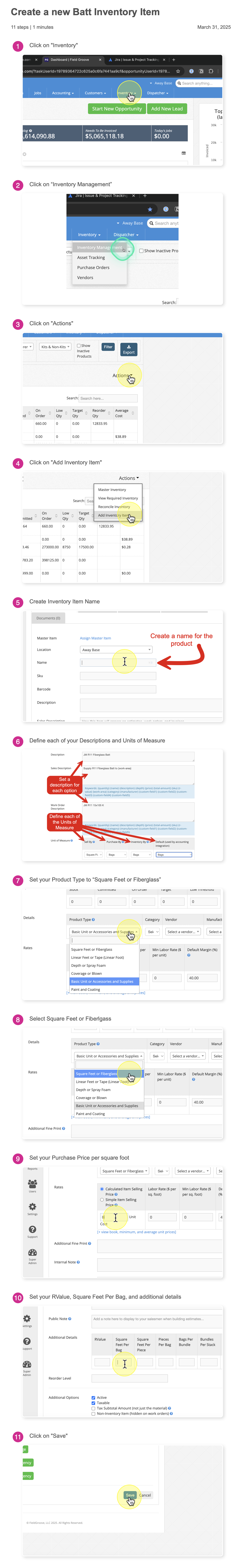 How do I create a new batt inventory item? Follow these quick sets to create a new batt inventory item. These items are the building block for all your estimates.